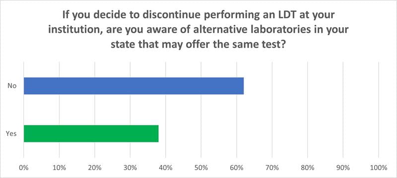 One of the concerns within the healthcare and laboratory communities is that the FDA rule may result in many laboratories discontinuing their LDTs resulting in a delay of testing services. Laboratories were asked (159 respondents) if they stopped performing their LDTs, was there another laboratory within their state to offer the test(s).
