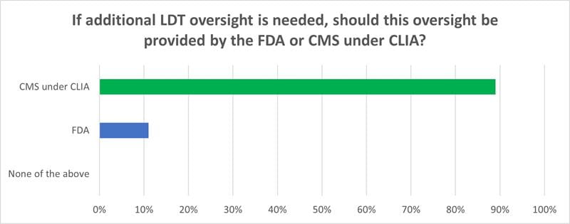 A final wrap-up question asked participants (170 responses) if additional LDT oversight is necessary, which government agency should provide it – the FDA or CMS/CLIA.